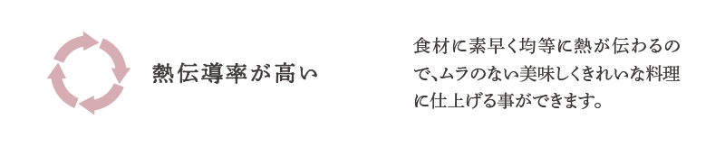 銅は、熱伝導率にとても優れており、食材に素早く均等に熱が伝わるので、