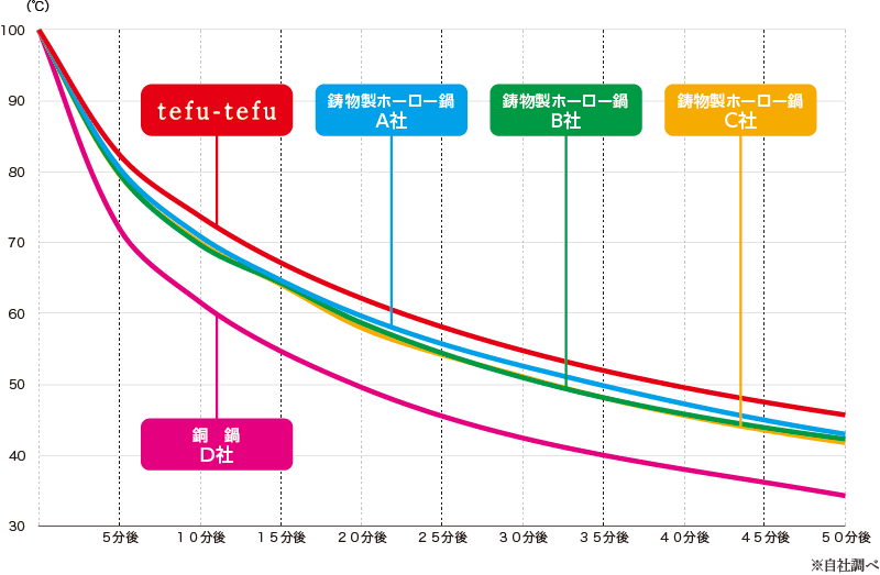 「tefu-tefu」と「A社・B社・C社の鋳物製ホーロー鍋」と「D社の銅鍋」の保温性能を測定しました。